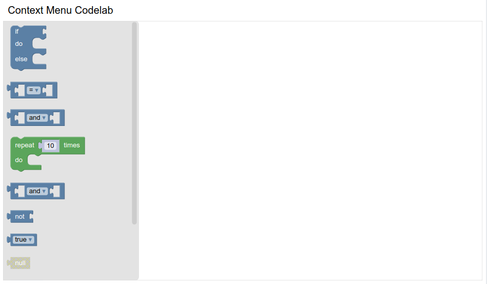 index.js- The codelab's logic. To start, it just injects a simple workspace.index.html- A web page containing a simple blockly workspace.