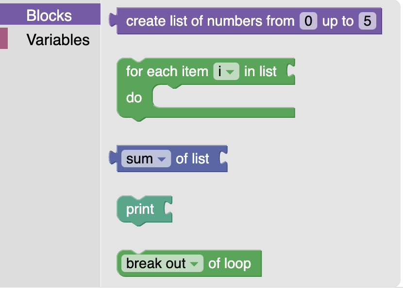 Open the file starter-code/index.html in a browser to see what it looks like. You should see a Blockly workspace with a toolbox, and space below it for generated code.